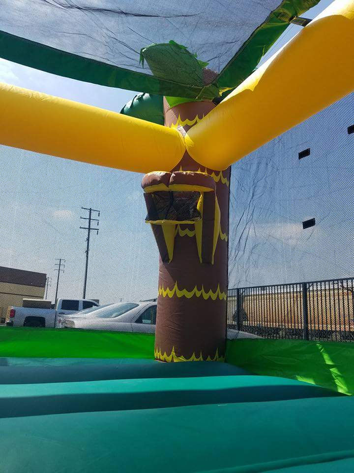 Tropical Aloha Athletic Mega Wet Dry Combo is a fantastic Commercial Inflatable Combo, providing a Huge Bouncing Area, a Climbing Ramp, a Basketball Hoop and a Slide. The slide itself has an inflatable pool at the end to provide kids with extra padding. This combo can be used as dry and wet for all season long.1 (one) 100 foot garden hose is included with this rental. The huge inflatable Combo measures in at 24′ long x 12.5′ wide x 15′ high overall. Commercial Safety Netting and Snap-Shut Door keep kids playing safely. This Athletic Bouncy Castle is great for Rental and Commercial Recreational applications with its lightweight body which make the setup and roll up much easier. The 13′ x 24′ x 15′.