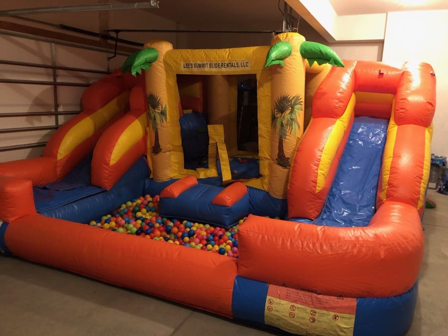 It has a bounce area in the center with a slide on each side. The landing is inflated so it can be used all seasons.. 1 (one) 100 foot garden hose is included with this rental. 16x15x8 feet, it weighs around 200lbs and can hold individuals up to 200lbs. and total max weight of 700lbs.