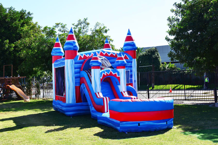 This Liberty Moonwalk Combo features 6 Ft. single lane slide along with an inflated landing zone for dry use. Fully enclosed entrance helps small children fall off from the side of the ramp. 1 (one) 100 foot garden hose is included with rental. Tunnel under the slide is great for children to run through and don’t forget the awesome hoop in the interior. Convert to a wet bounce house slide by simply connecting any garden hose to the internal water bladder system. 31’L x 13’W x 15’H Approximate Weight: 275 lbs