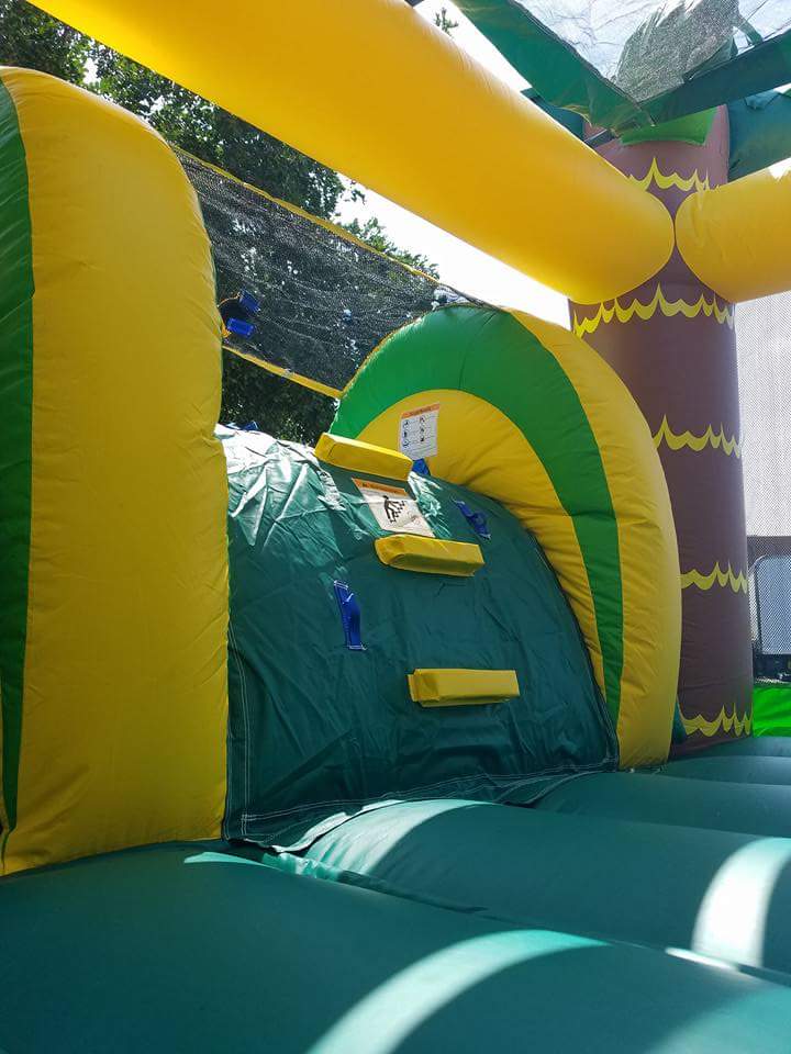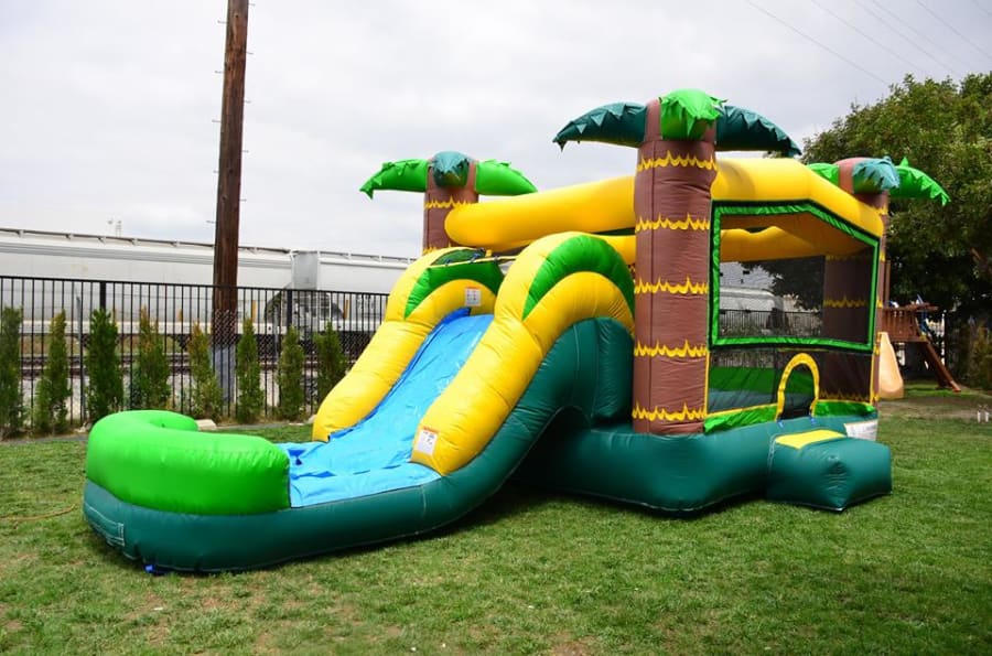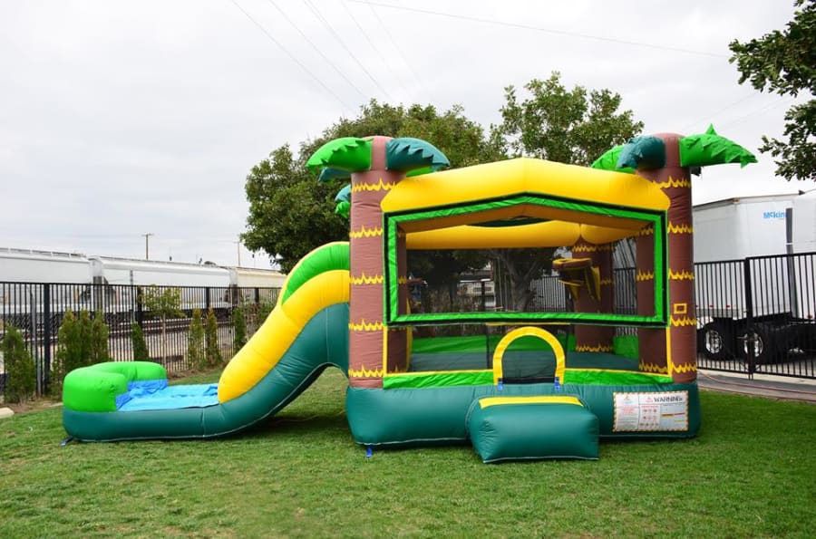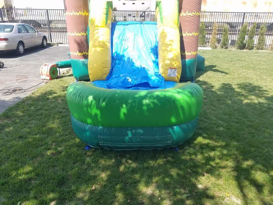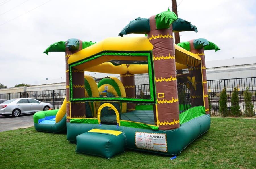 Tropical Aloha Athletic Mega Wet Dry Combo is a fantastic Commercial Inflatable Combo, providing a Huge Bouncing Area, a Climbing Ramp, a Basketball Hoop and a Slide. The slide itself has an inflatable pool at the end to provide kids with extra padding. This combo can be used as dry and wet for all season long.1 (one) 100 foot garden hose is included with this rental. The huge inflatable Combo measures in at 24′ long x 12.5′ wide x 15′ high overall. Commercial Safety Netting and Snap-Shut Door keep kids playing safely. This Athletic Bouncy Castle is great for Rental and Commercial Recreational applications with its lightweight body which make the setup and roll up much easier. The 13′ x 24′ x 15′.