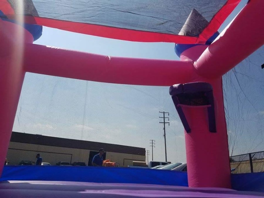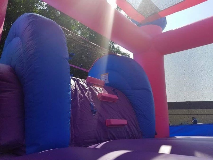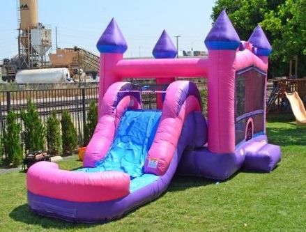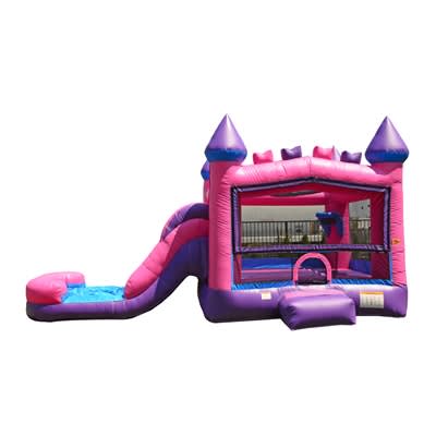 ′ Princess Castle Moonwalk Combo is a fantastic Commercial Inflatable Combo, providing a Huge Bouncing Area, a Climbing Ramp, a Basketball Hoop and a Slide. The slide itself has an inflatable pool at the end to provide kids with extra padding. This combo can be used as dry and wet for all season long. 1 (one) 100 foot garden hose is included with this rental. The huge inflatable Combo measures in at 24′ long x 12.5′ wide x 15′ high overall. Commercial Safety Netting and Snap-Shut Door keep kids playing safely. This Athletic Bouncy Castle is great for Rental and Commercial Recreational applications with its lightweight body which make the setup and roll up much easier.