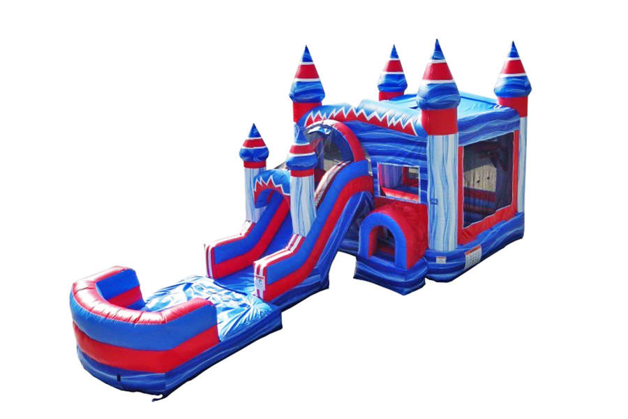 This Liberty Moonwalk Combo features 6 Ft. single lane slide along with an inflated landing zone for dry use. Fully enclosed entrance helps small children fall off from the side of the ramp. 1 (one) 100 foot garden hose is included with rental. Tunnel under the slide is great for children to run through and don’t forget the awesome hoop in the interior. Convert to a wet bounce house slide by simply connecting any garden hose to the internal water bladder system. 31’L x 13’W x 15’H Approximate Weight: 275 lbs
