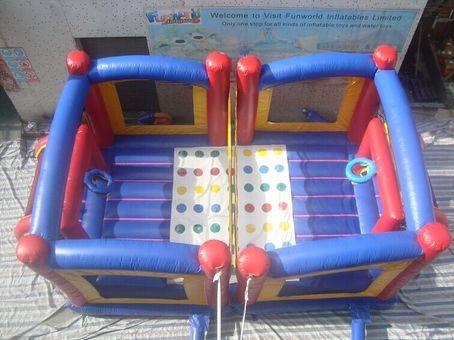 This is a two piece inflatable, custom designed. Each piece weighs 175 lbs and velcros together in the middle. Kids can play a number of sports, basketball hoops, soccer goals and a net are all present in the interior. It also has an awesome twister feature that I love. 200lb individual user weight Length: 30′ Width: 15′ Height: 14′