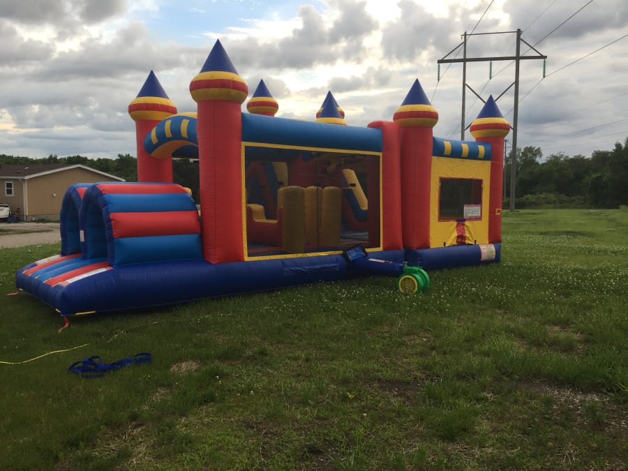 This is our newest unit. It consists of the three separate pieces that can be configured three different ways. It can be one straight line and when it is it is 47L x 10W x 15H. The first pieces has three different sets of pops ups. It then leads in to an open bounce area. This bounce area has three sides that are held closed with heavy velcro and blower tubes on each side. This allows you to choose whether you want the obstacle course to go straight, make a 90 degree turn to the right or a 90 degree turn to the left. It then flows in to the slide area. In the 90 degree configurations it is 30L x 28W x 15H. It comes with three blowers and anchors to prevent it from moving. Maximum total user weight is 500lb.