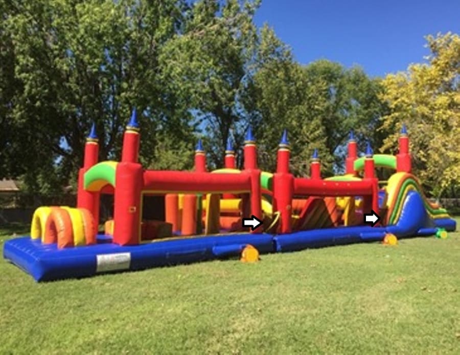 POWER REQUIREMENTS – This inflatable has three, 1 Horse Power blowers and requires THREE dedicated outlets/circuits to operate. Equipment must be located no further than 100 feet from an exterior outlet or generator. MAXIMUM OF ONE 100 foot extension cord per blower – Coba’s Creations provides the extension cord upon set up.