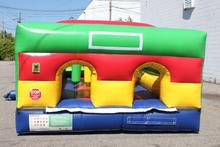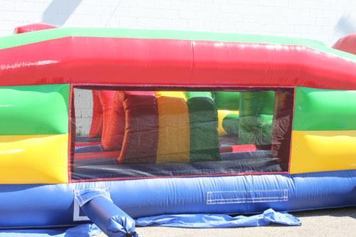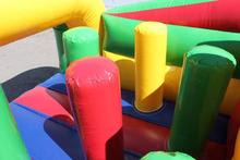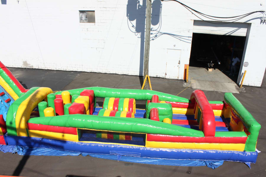 Racers run through the course and up/down the slide through the obstacles and up to a larger slide that ends in an inflated landing. The three sections connect with velcro and a lace up strap similar to the lacing on a shoe. 56 x 11 x 12 feet. A 66 x 20 unobstructed space is needed for this unit, with no trees, power lines… overhead This is a commercial unit that was custom made. It is three pieces at 275 lbs each piece. 1 (one) 100 foot garden hose is included with the rental.