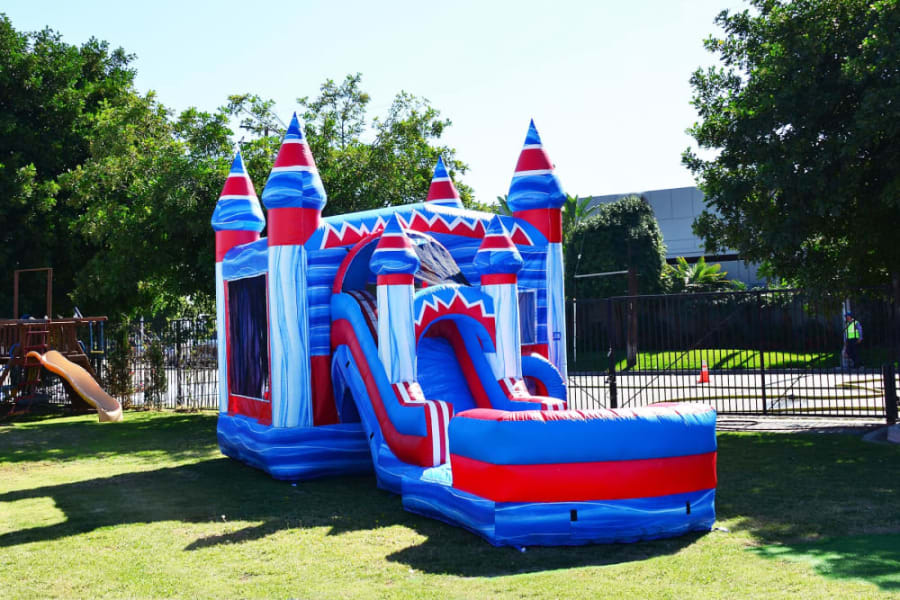This unit is great for 4th of July parties or Super Hero parties! It has a LONG slide and collects water at the end of the slide, if you are using it wet. It is great for adults and children. This unit is tall, so make sure it is outside or you have a tall gym ceiling.